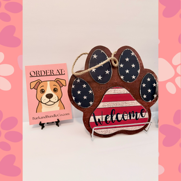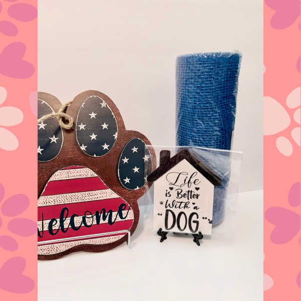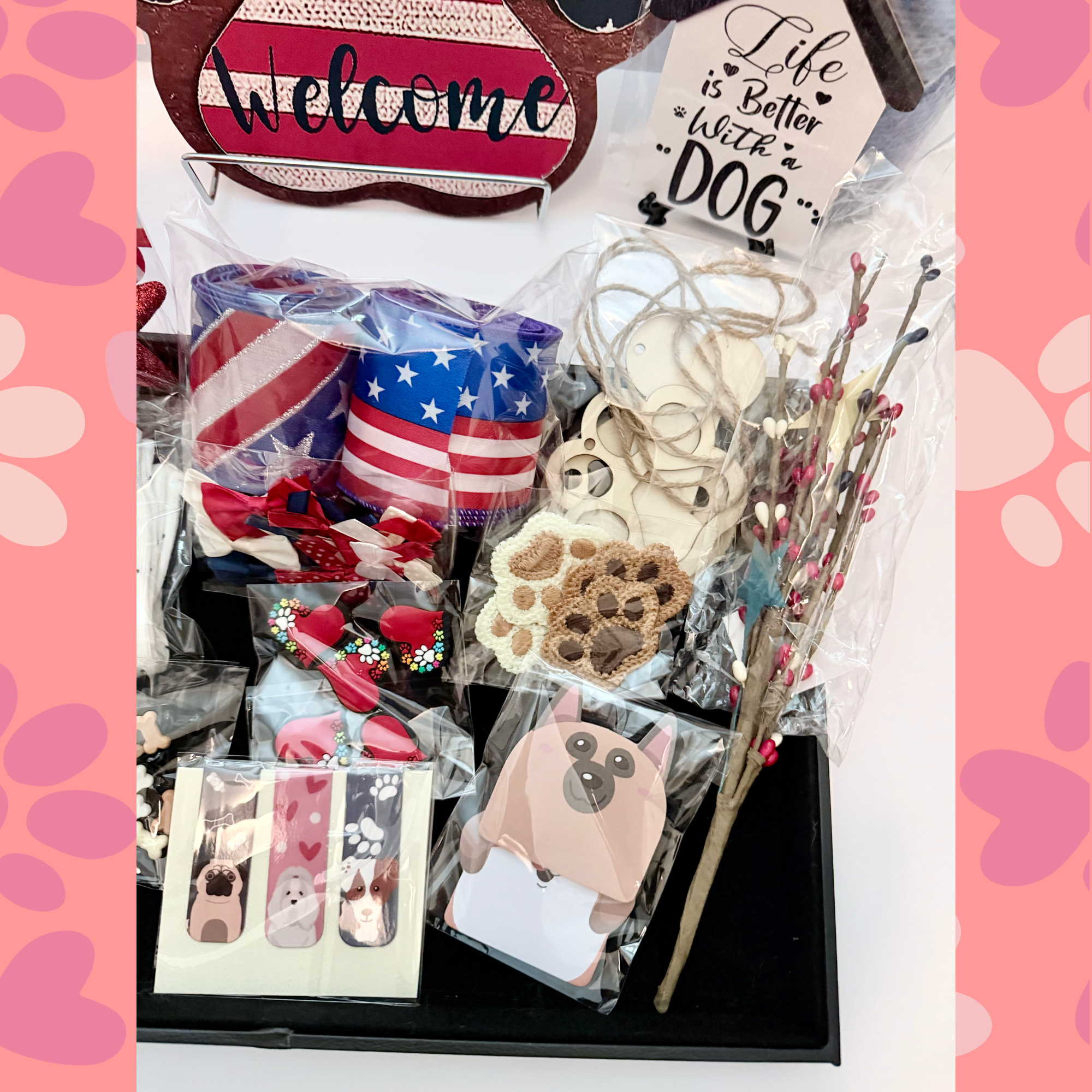 A cozy, Americana‑inspired bundle filled with red‑white‑and‑blue charm and the love we carry for our pets. This bundle holds treasures like a wood flag paw‑print hanging sign, a finished mini wood sign, and unfinished wood ornaments ready to be decorated with your own memories. You’ll love to discover blue deco mesh, Americana wired ribbon, glitter and plush vase filler, and multi‑color bone and heart embellishments to bring your crafts to life. Also included are paw‑print knitted pieces, a wood and metal craft spray, and a mixed bag of beads and bows for heartfelt projects. And tucked in for comfort and everyday joy, you will find cozy socks, a magnetic bookmark set, and doggie sticky notes—small reminders of the pets who make our homes feel like home.