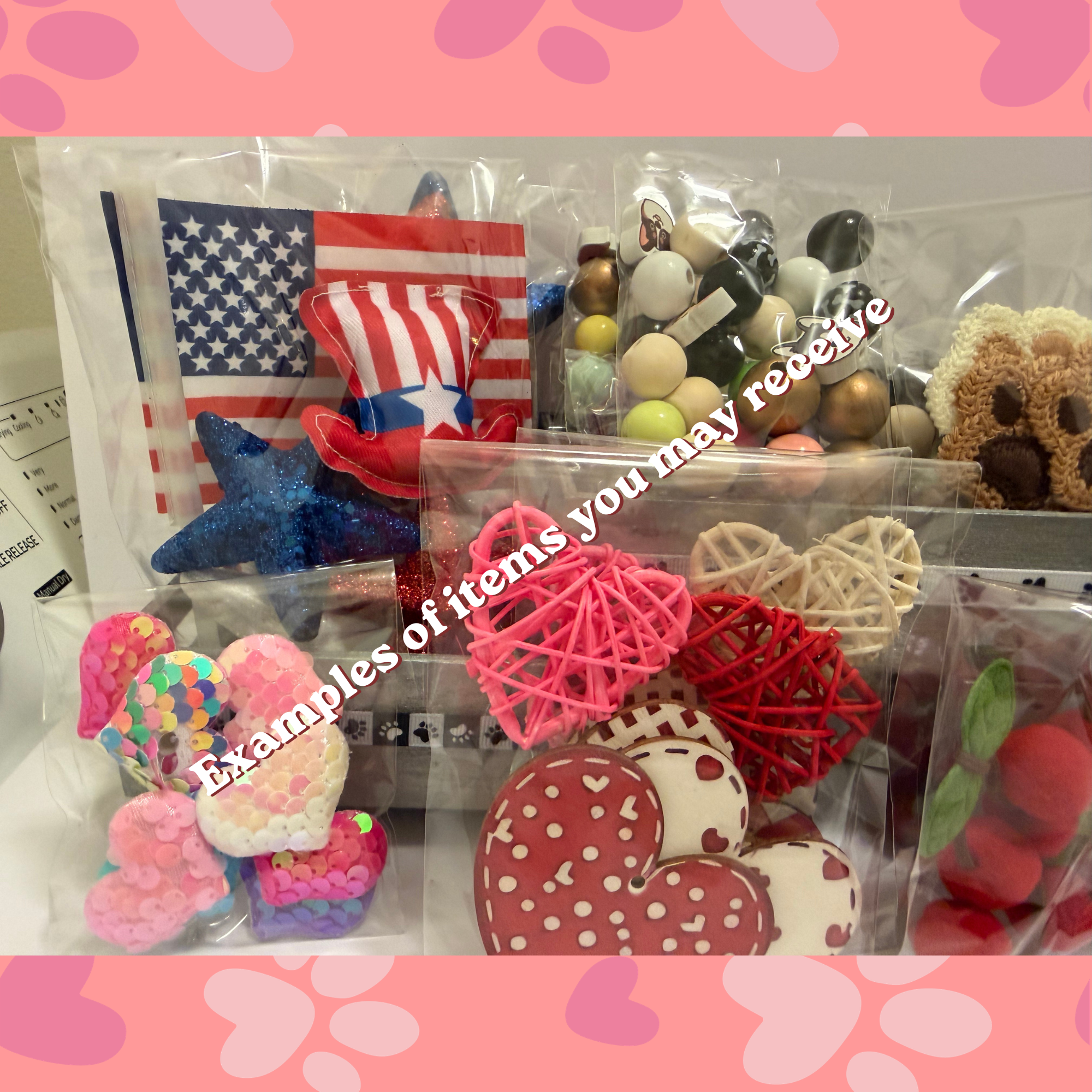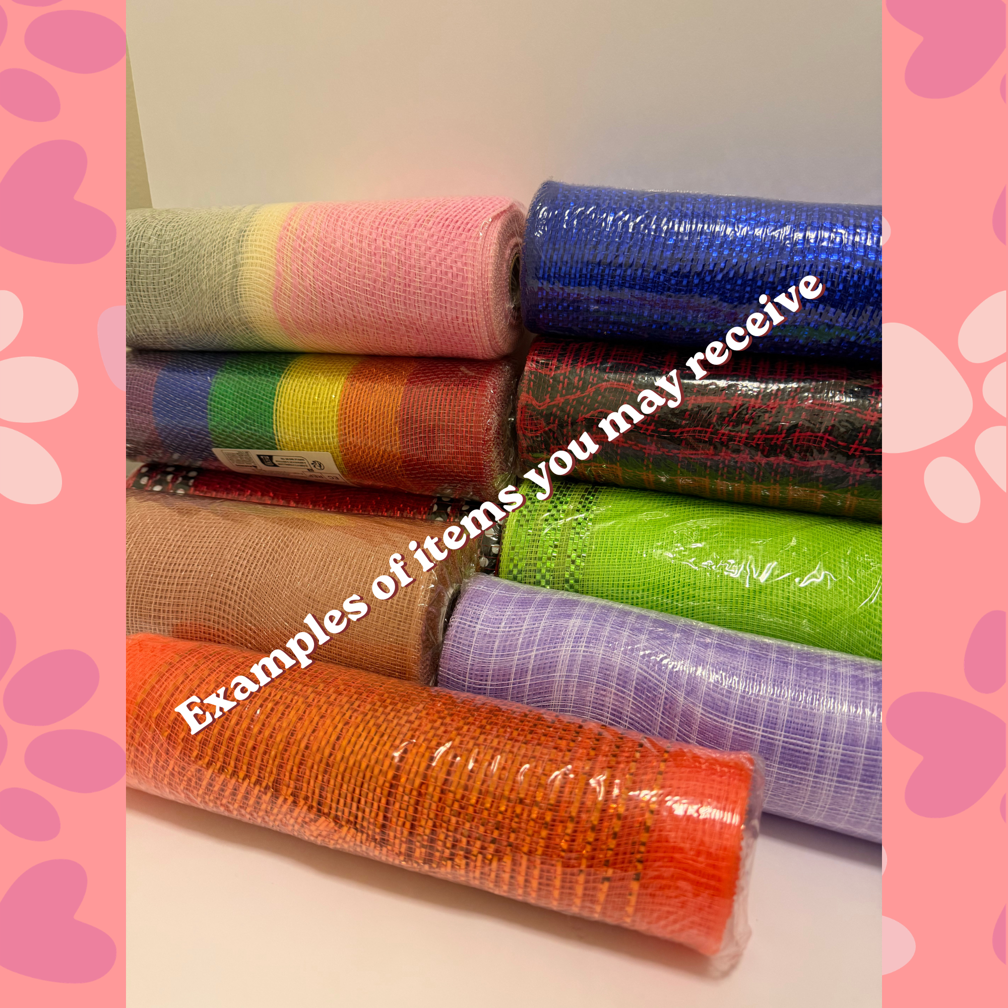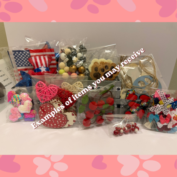 A playful, treasure‑hunt style mystery bundle filled with colorful craft supplies, pet‑themed surprises, and little delights you didn’t know you needed! Each pack may include a mix of deco mesh, ribbon, a charming seasonal sign, vintage items, or finished wood décor ready for your next project. You might uncover beads, bows, charms, or quirky embellishments that spark instant inspiration. Tucked among the crafting pieces are thoughtful extras like a memorial bracelets, Rainbow Bridge ornaments, suncatchers, or keychains—gentle reminders of the pets who stay in our hearts. Some bundles will also include cozy and practical surprises such as socks, a bookmark set, sticky notes, hair accessories, washi tape, a zippered pouch, or a pet-themed pens. Every bundle is curated to bring joy, comfort, and inspiration—one small treasure at a time and we love hunting for new quirky and colorful surprises to tuck into future bundles.